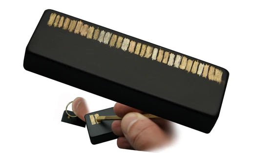 The touchstone is actually made of jasper, a hard stone. It has the particularity of attaching traces of gold, and of not reacting to the acids used. Thus, you can know the alloy of the jewel with quite great precision.